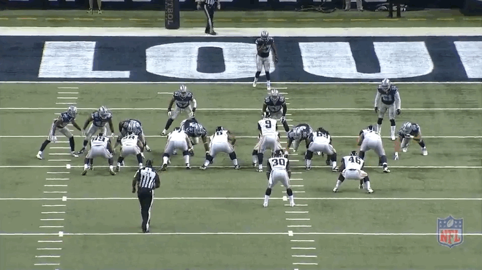 Above, Zac Stacy takes the ball on 4th and 1 and is wrapped up and sent back when 59-Anthony Hitchens diagnoses and reacts to the pulling guard and destroys the play and the Rams drive. Hitchens is not playing passively nor gently. He is attacking – almost like McClain or Lee in front of him.
