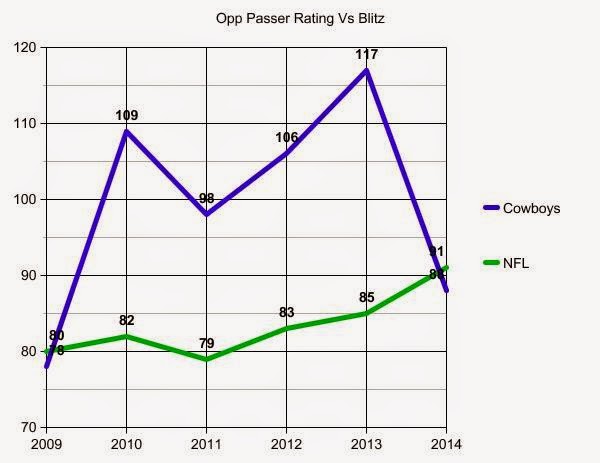 So, you can see the green line, which is the NFL average passer rating versus the blitz. You can see it is creeping higher and higher each year as rules and QB play conspires to make this a league where defenses never have success. You can see the blue line, which represents the Cowboys and the atrocious manner in which they are way worse than the league from 2010-2013.