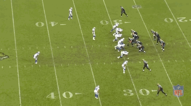 Now, here we go this week. 4th and 1. Toby Gerhart and pulling guards. Let me use this opportunity to again campaign against any team pulling guards on 4th and 1. It never works against a 9-man front. There is too much traffic to navigate and they generally just get in the way. Anyway, here is 59-Hitchens picking his way through the bodies, mirroring Gerhart perfectly, squaring him up, and ending the drive right then and there. Beautiful.