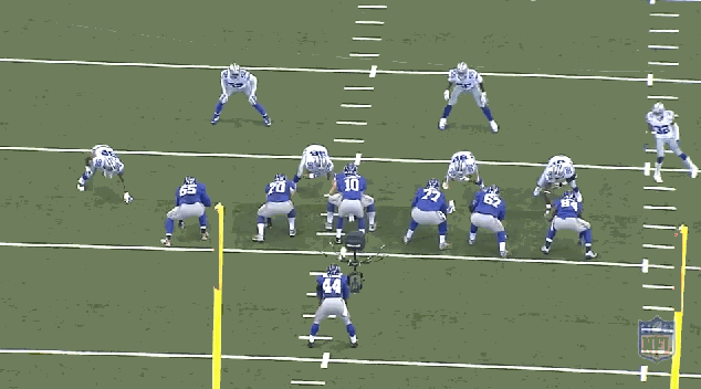 Giants try another inside run on the Cowboys, but Justin Pugh is not strong enough to deal with Crawford here. He rams his way through traffic and makes the tackle himself.