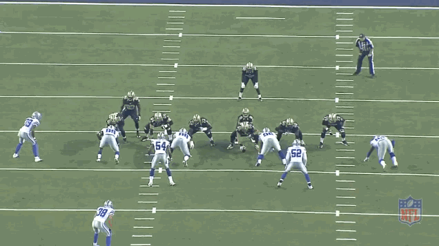 Here is one of the best plays of the season against the Saints. The forklift move on Jahri Evans – Yes, one of the best guards in the league – where he gets under his pads, and rides him right back before tossing him to the side and pouncing on Brees. Drew gets rid of it, but Crawford won that play big.