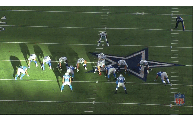 This looks like a classic 2nd down conflict. Detroit is loading up the gaps, Romo is checking out into a play-action pass (I think) and Detroit has the late pressure show with 52-Tapp going from Smith’s outside to Leary’s shoulder at the perfect moment, leaving a wide B-Gap for 59-Whitehead. Detroit didn’t need 8 in the box to chase Dallas out of the run and then they were extra frisky with bringing LBs through gaps opened up by the directional rushing of their DL. If Murray aborts the fake, he might get to Whitehead, but again, the Detroit game plan – especially 2nd down defense – was sound as can be against the Dallas 2-TE offense.