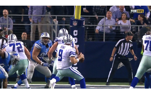 This is where we get into the conversation – like the 3rd and 20 in Seattle – of “who was Romo throwing the ball to? Now, before you tell me what Romo said in the postgame press conference (he said he was throwing to Bryant but at the last second he changed his mind and threw it to Williams), just look at his angle. It is the same throw. If Williams isn’t there, the ball is caught by Bryant and is right on the numbers. He didn’t have to adjust at the last second. It is the same target, right? It really doesn’t matter. Unbelievable moment.