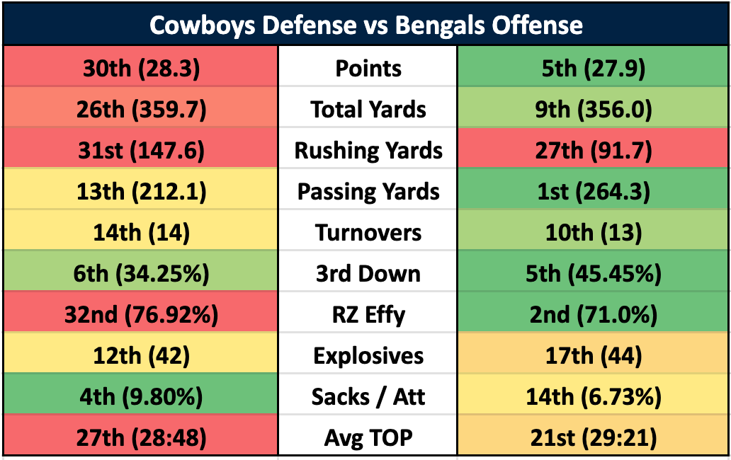 Dialing Up 3rd Down Blitzes - The Dallas Cowboys are one of only 2 teams to pressure opposing quarterbacks on over half of their 3rd down dropbacks, doing so 50.9% of the time. This due in part to generating the highest pressure rate when blitzing (50.0%) and the 5th-highest 3rd down blitz rate (41.7%) in the NFL. Matchup: Since entering the league in 2020, Joe Burrow has recorded a success rate of 48.3% against third down blitzes, the 3rd-highest among 46 quarterbacks to face at least 50 3rd down blitzes in that span.
