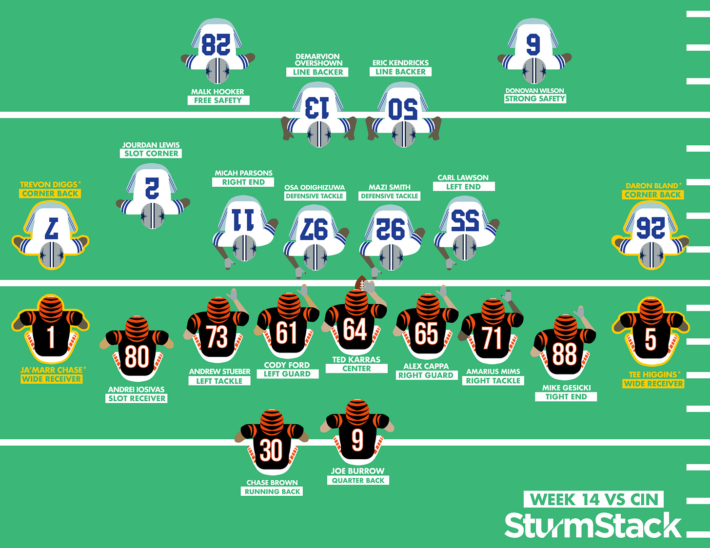 Do we expect that this will be the game that we finally get Trevon Diggs, DaRon Bland, and Jourdan Lewis all in the same game at the same time? Diggs has been listed as questionable, so we won’t hold our breath. But, they could really use him out there as JaMarr Chase and friends will offer a very fun test.
