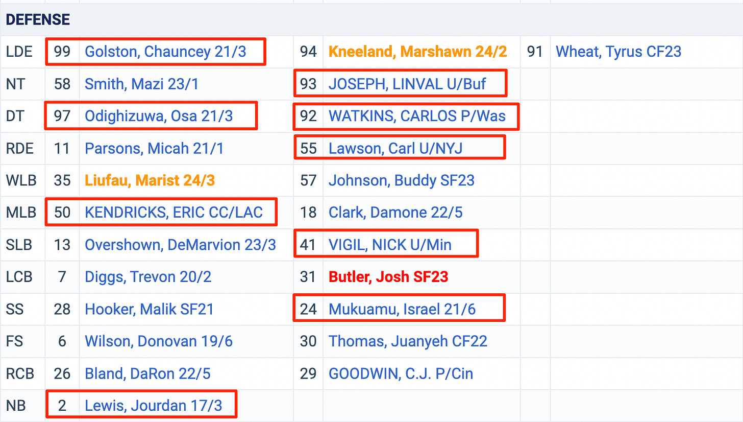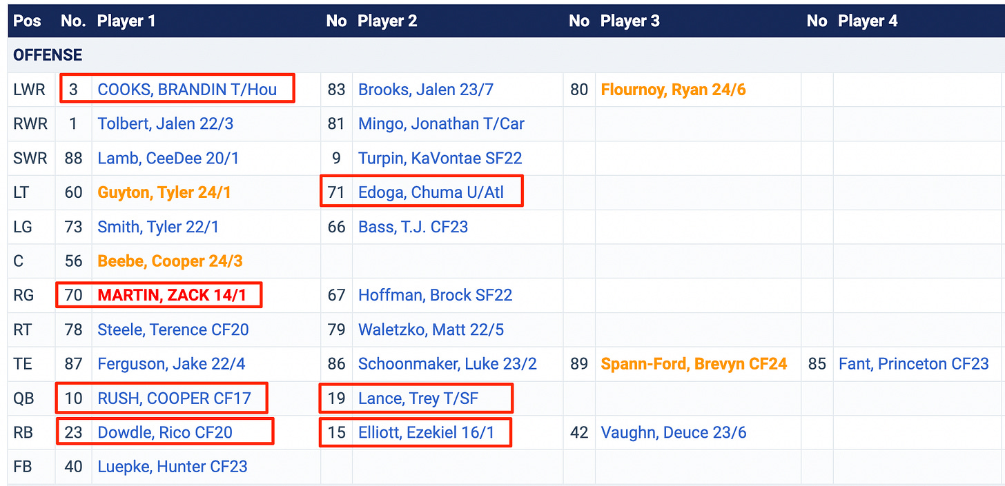 I do this exercise so those of us who are of the hardcore football nerd variety are locked in on what is at stake over the last month. We have to look at these red squares and start making decisions on anyone we want to pull aside and getting something easy done for 2025-26 right now. For instance, Rico Dowdle is a guy I would love to do something easy with. Osa Odighizuwa is a guy I never want to lose, but his price might force that. Of course, maybe a conversation can sort that even now.