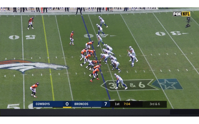 Next 3rd down, Denver goes zone and fools Prescott a bit. The pass rush from LT/LG side gets home and into his line of sight. He has to double-pump and by then it is too late. Chaz needs to switch guys a bit faster, but easy for me to say.