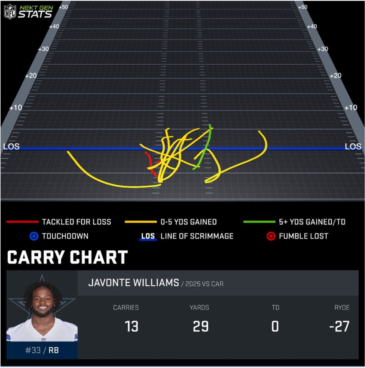 Again, we don’t want to overreact to the last game we see, but this was very much the opposite of the Green Bay and New York Jets games. Those were stout defenses, too, so perhaps this is a stylistic issue with Carolina’s front, but it is worth noting how badly the battle up front went.