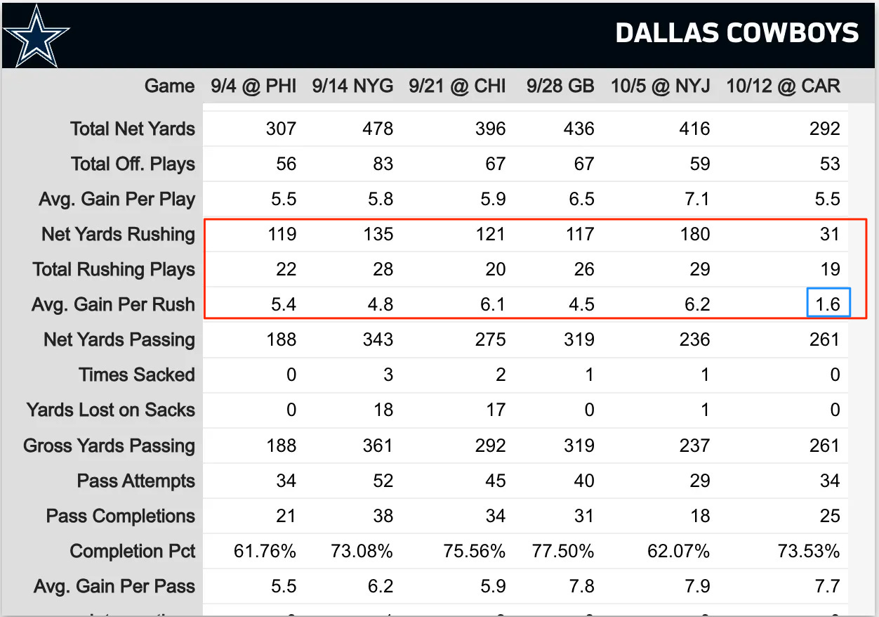 The offense has been wonderful this year because the running game has existed. Below, as we look at the game-by-game production, you will see that the Dallas rushing offense tumbled on Sunday in Charlotte. To the Panthers credit, they were not impressed with the Cowboys being the 8th-ranked run offense in the league. Look at the red box: