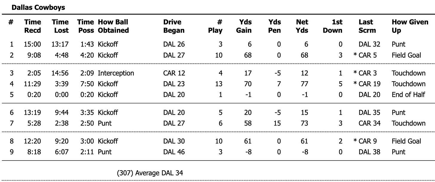 Instead, the offense ran 13 plays and had the ball for slightly more than 5 minutes. They would gain two first downs and run for zero. Carolina, meanwhile, were the team to drag the Cowboys defense out into the deep water and the tired Cowboys simply were left to drown. They did. Carolina had the ball for 9:49 and ran 23 plays. They gained eight 1st downs, and, of course, out-scored the Cowboys in the final quarter, 10-3.