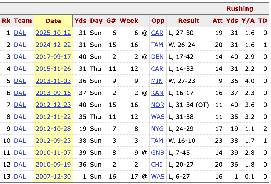 In fact, as we go back 20 years, it has only happened 13 times to Dallas. They are 3-10 when it happens and we might even ask how they won three times while having no running game at all.