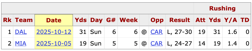 First, Carolina is a top-tier rush defense and that might be one of the league’s well-kept secrets. I know that I was caught off-guard, but I will also confess that my Carolina Panthers attention span is pretty low these days. I assume Dallas knew, but when I ran the entire NFL this season to see how many games where one side rushed for less than 40 yards in a game, here were my results: