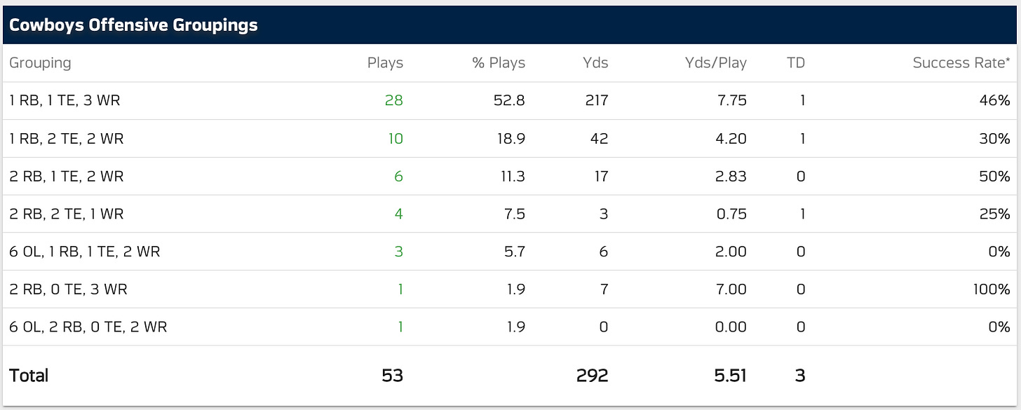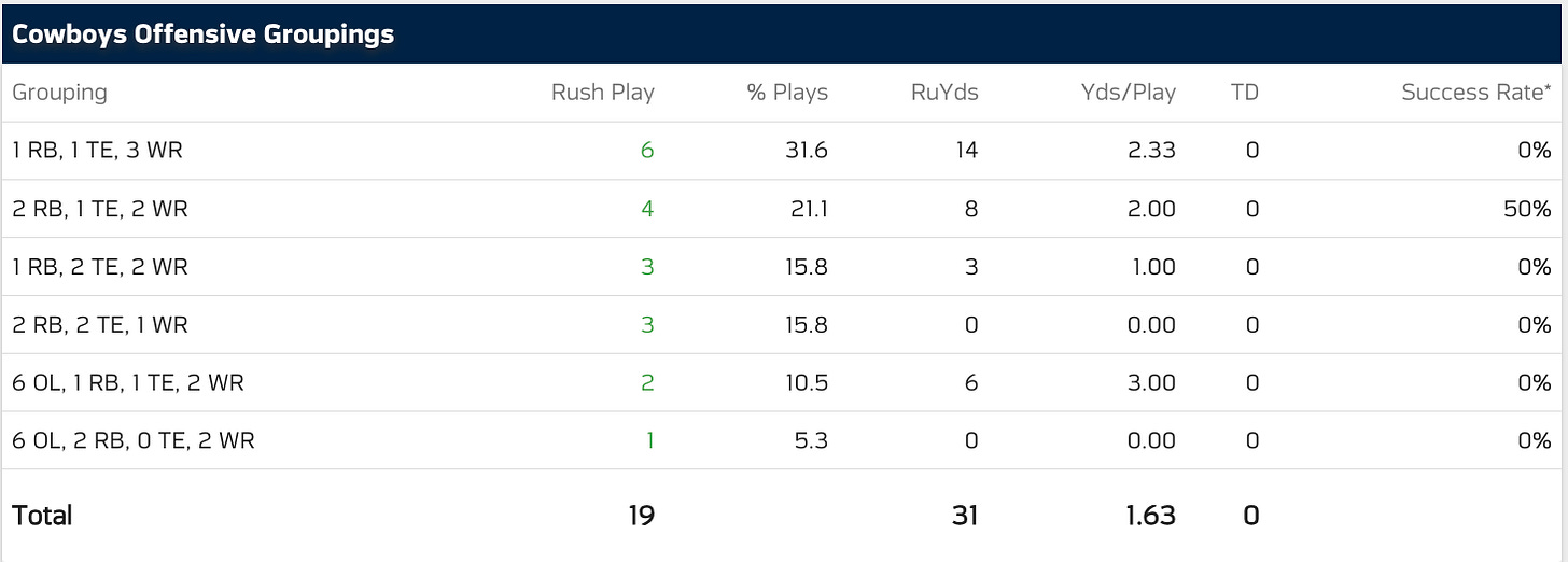 Now, look at the success rates. The Cowboys called 19 run plays and were successful on just 2 of them. 11%??? Anything less than 40% is bad. 11%?