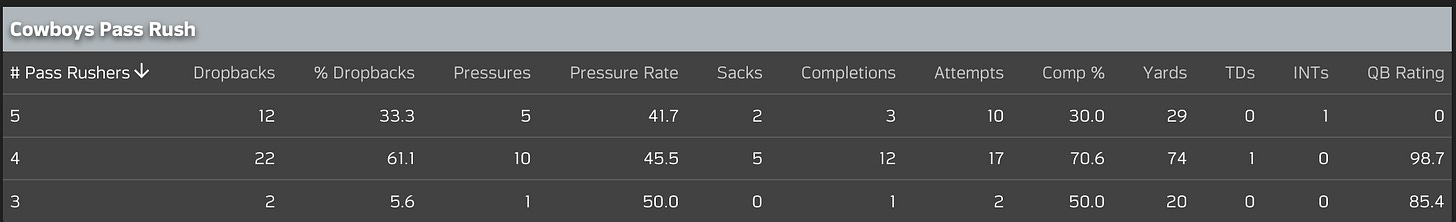 Dallas blitzed a dozen for 33%, but quickly noticed they were getting home with ease when they only rushed a normal four so it was not a particularly heavy blitz game.