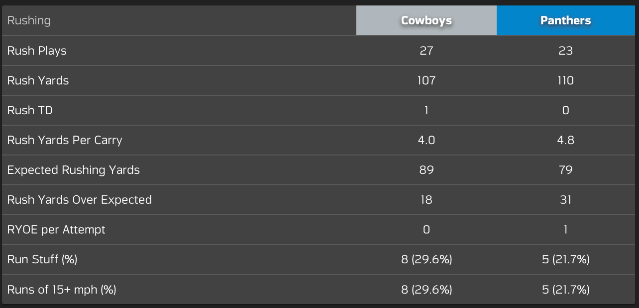 If you look here, you see that both teams ran the ball well, but Carolina ran it marginally better. Also, Carolina’s offensive line seemed useless in pass protection, but now they seem to be making huge holes for both Carolina running backs. Dallas had allowed 84 yards on the ground before halftime and almost all of it was on garden variety run plays right at the Cowboys defense.