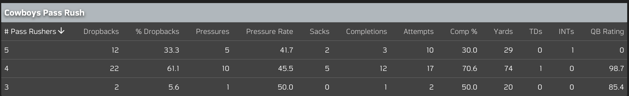 Dallas blitzed a dozen for 33%, but quickly noticed they were getting home with ease when they only rushed a normal four so it was not a particularly heavy blitz game.