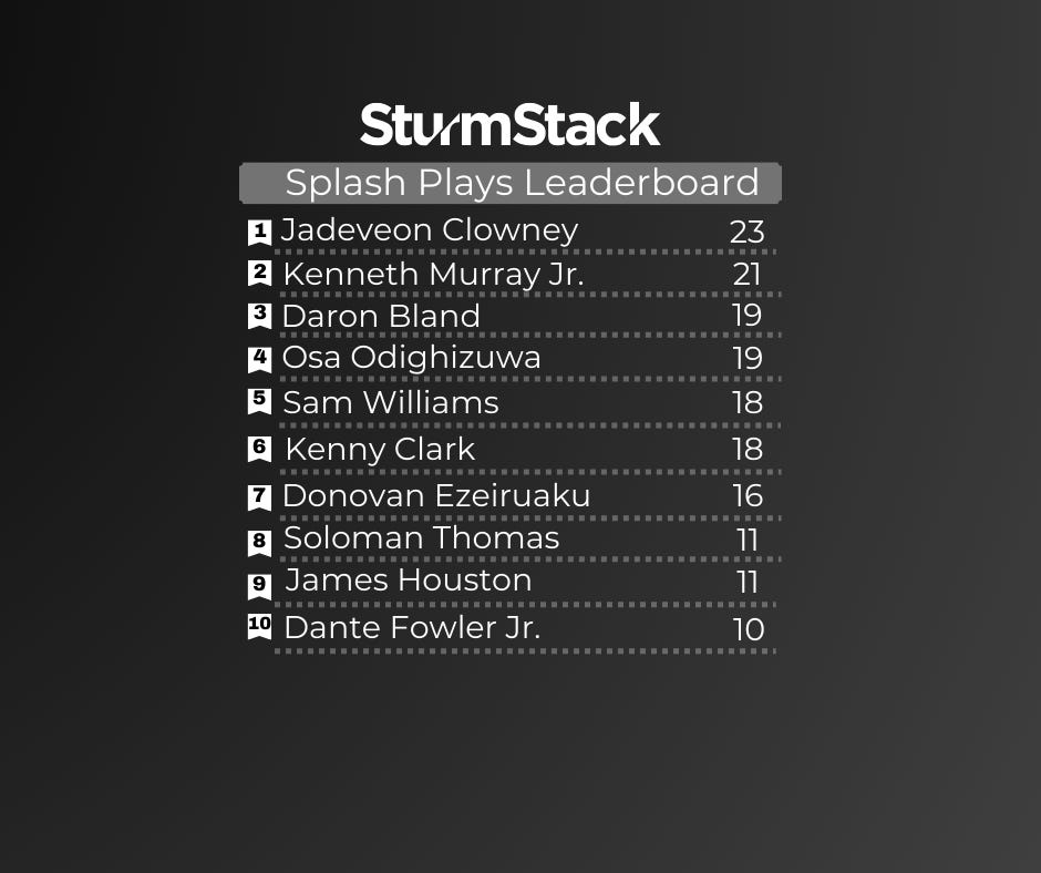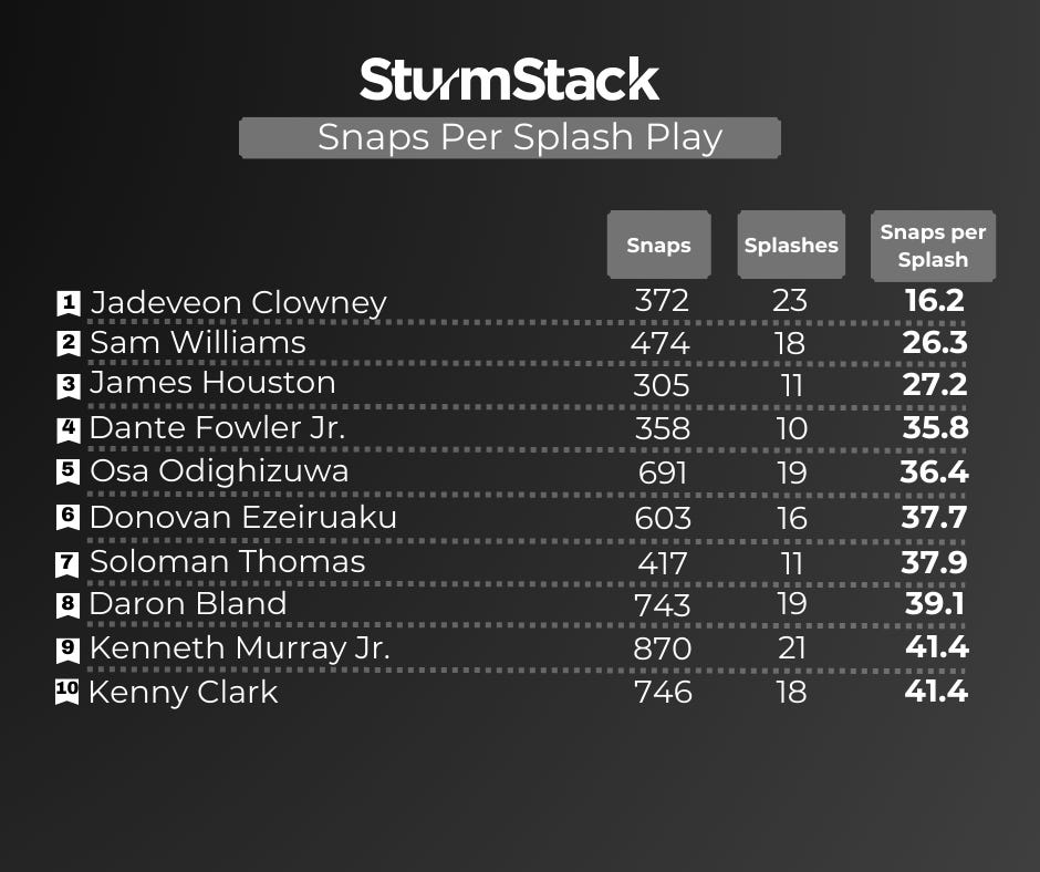 Josh also ran the numbers as we always try to do for the “snaps per splash” which takes all the players with at least 10 splash plays and then divides them by playing time. As you can see, Kenneth Murray led the raw splash plays all season, but also played so much more than anyone else on the list. When ordered this way, he slides down to 9th.