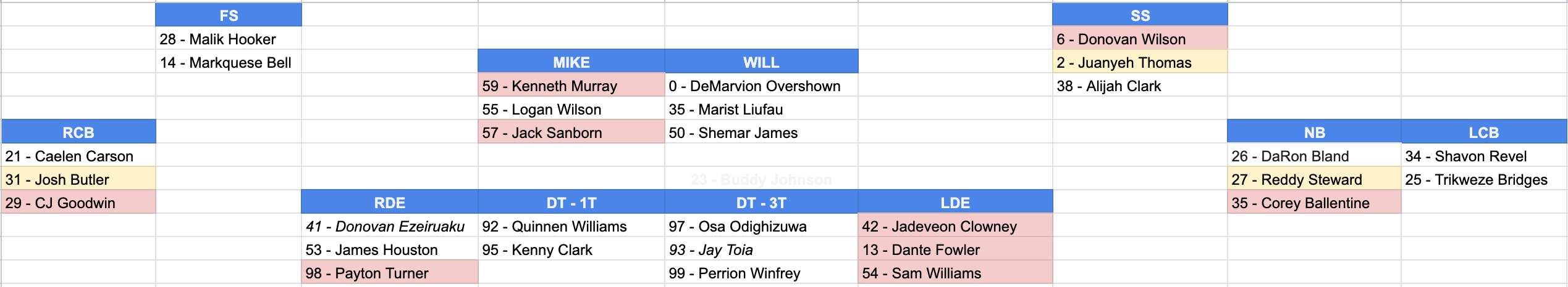 Just like yesterday, I wanted to at least show you how the depth chart on defense looks as we enter the spring. Now, on defense, please keep in mind that we don’t even know the scheme, so I think a lot of this will be “figure it out after we hire a DC”, but as it stands right now, the players in white are under contract.