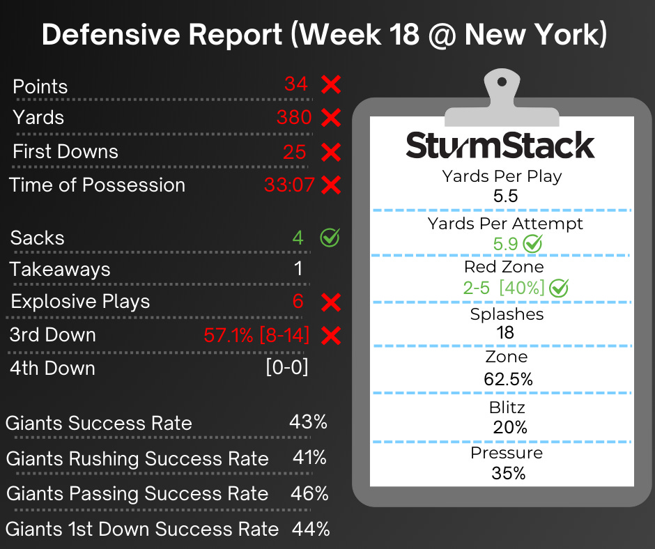 Points, worse. Yards, worse. Passing yards, much worse. Takeaways cut in half. 3rd downs went horribly wrong to one of the worst third-down defenses in history. Explosive plays took a big step backwards. Sacks dropped massively (see: Parsons, Micah). And the thing was a complete mess.
