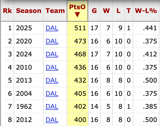 And yes, as you look at those eight teams below, you see that Dak Prescott has now been the QB for the three worst Cowboys defenses of all time and that Tony Romo has another three.
