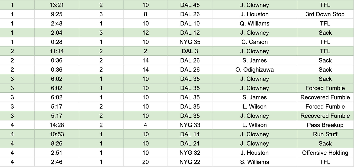 Third-down stop from the Cowboys and a rare one, so let’s dig in. They play Cover-4 and nobody is open, so we look back at the pass rush and both edges are doing good things. Jadeveon Clowney is beating Jermaine Eluemunor on one side and Donovan Ezeiruaku is staying after 71-Marcus Mbow on the other side. Together, they corral him for what we would no doubt call a coverage sack that Clowney closes after some pursuit. Good work.