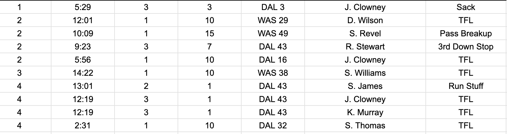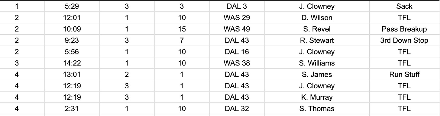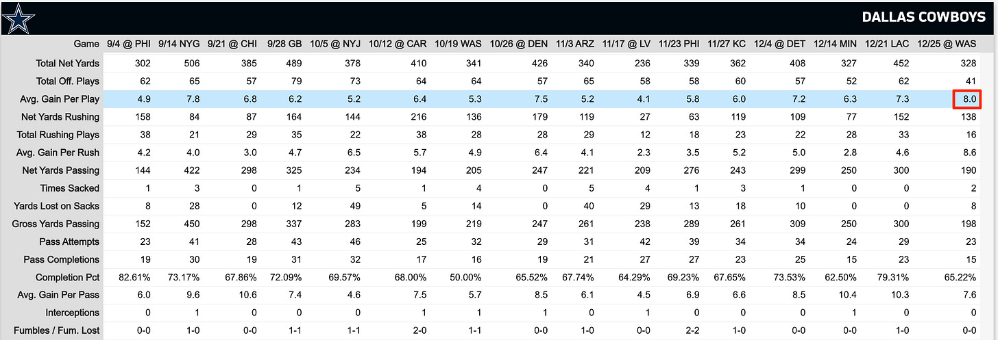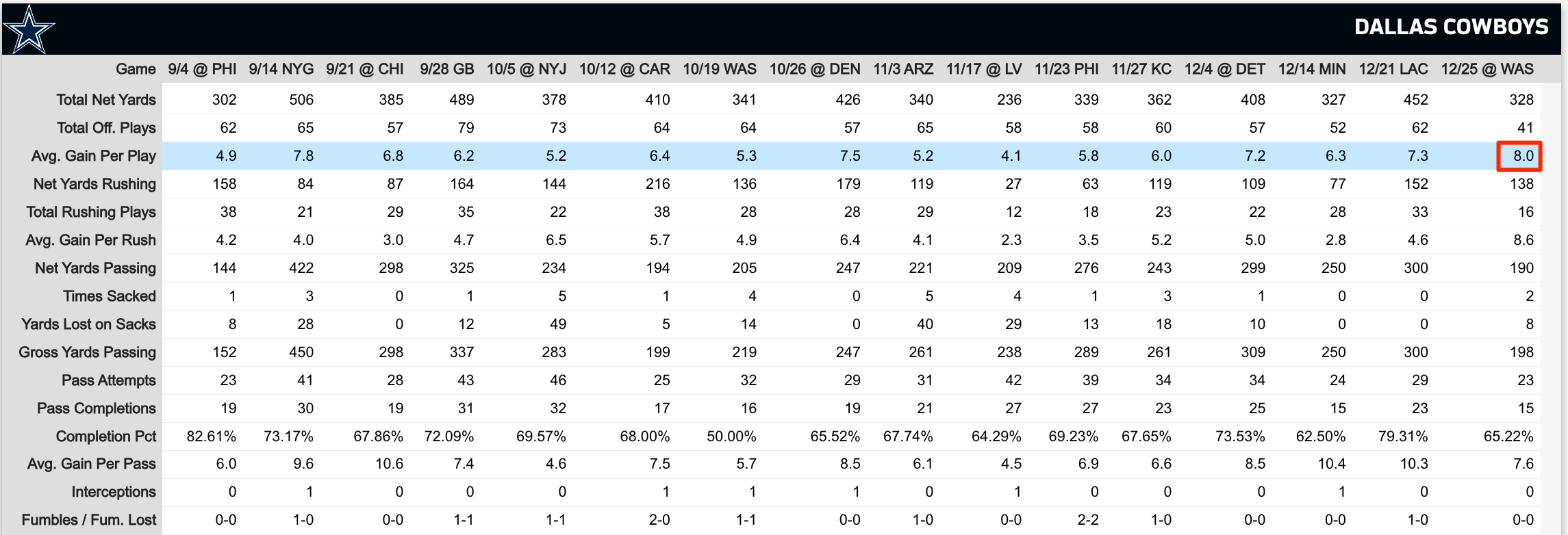 It is pretty hard to believe, but it is just the 6th time in Cowboys history they have given up 8 yards per play for an entire game – the first time since 2013! So, I realize they won comfortably, but we probably shouldn’t think the defense had much to do with it. Washington was actually getting plenty done with big plays and such, but they just weren’t able to get their hands on the ball.