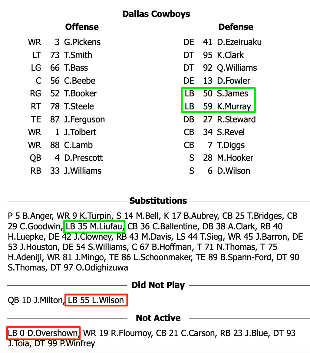 Let’s start with this screenshot of the official game book and note the linebackers: