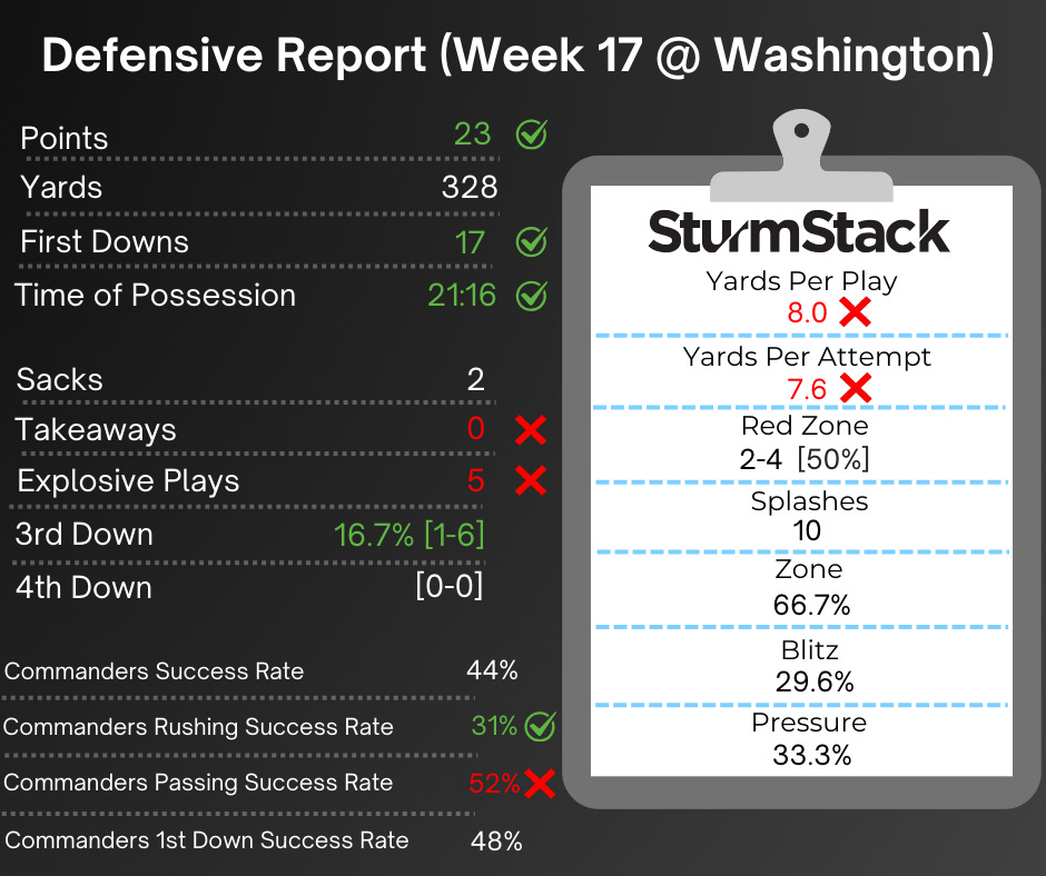 This Washington game was bizarre end product for the defense, yet again. They were not on the field much, but boy, they surrendered the season-high yards per play at 8 yards per snap! That is pretty hard to do, given how bad the defense has been this year.