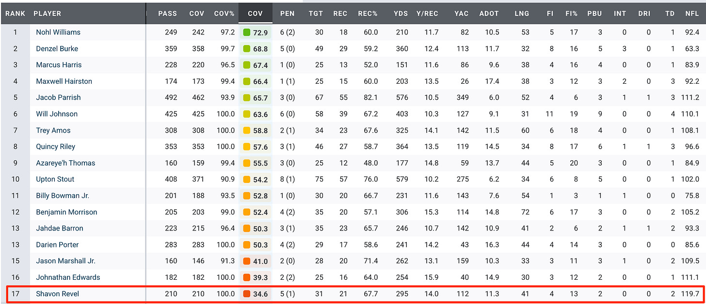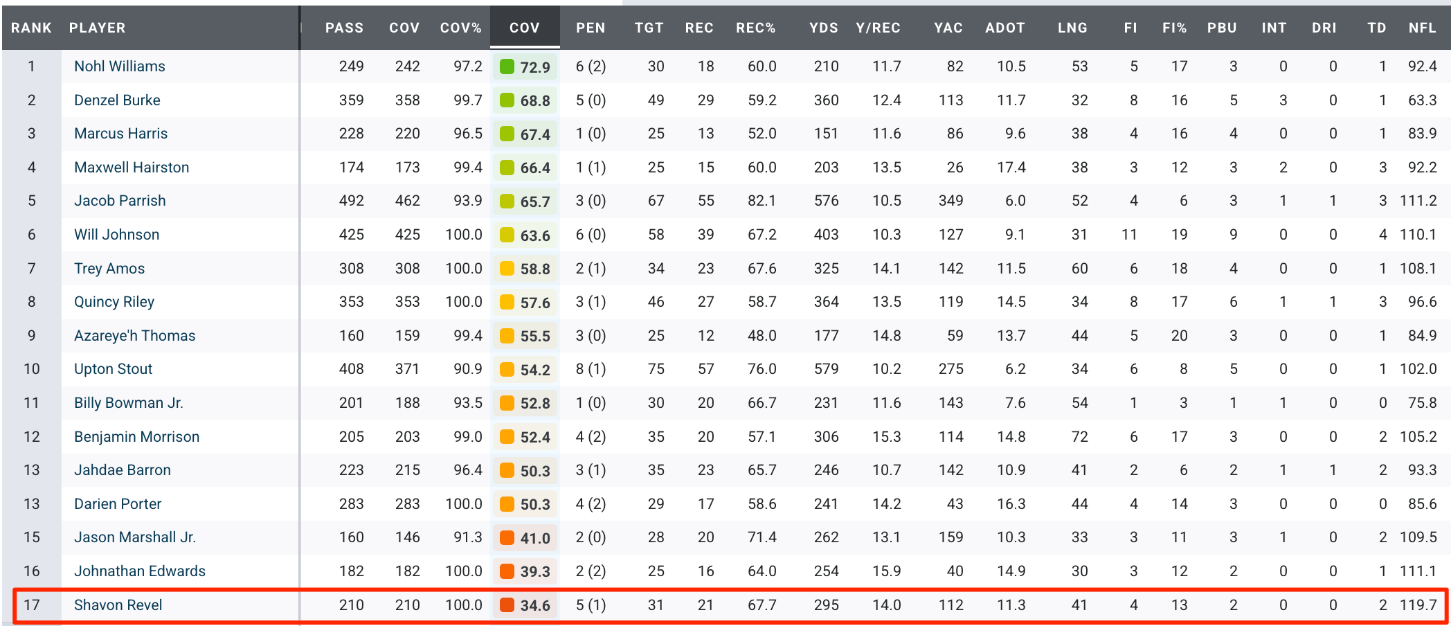 But, this has been a bumpy rookie season since he got on the field in November. In fact, according to PFF, there are 17 rookie corners in the league who have played enough snaps to be graded and Revel is 17th of the 17. That doesn’t offer much context, but if you are watching the games, you can see the opponents are going after him without much mercy.