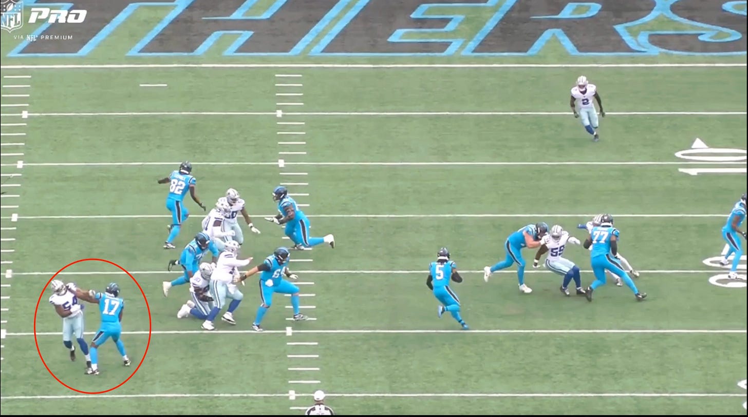 This one is another Cover 3 beater and the Cowboys play this so much on 1st and 10 that you have to know that they have plans to attack and isolate. So, not to be mean, but I am pretty sure this is 59-Murray again as the Panthers do the same thing. Clear out Bland with McMillan. Take Liufau to the flat with the TE. And then Dowdle vs Murray in space. This one is muddy and it puts the LB in a bind when the QB has nobody else closing him down, but once Dowdle clears Murray, he is as wide open as they get as the corner and safety are busy with the verticals. In fact, if Young wants to hit 17-Legette, he is available, too. Poor, poor, poor.