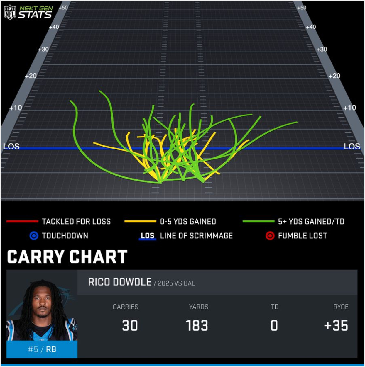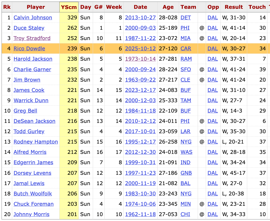 So, today, we are going to look at a brutally embarrassing defensive effort at Carolina where the Cowboys allowed Rico Dowdle into the record books. We detailed that plenty on Monday, but I did want to show you the list of players he joins below for “all-time performances against the Cowboys for yards from scrimmage.”