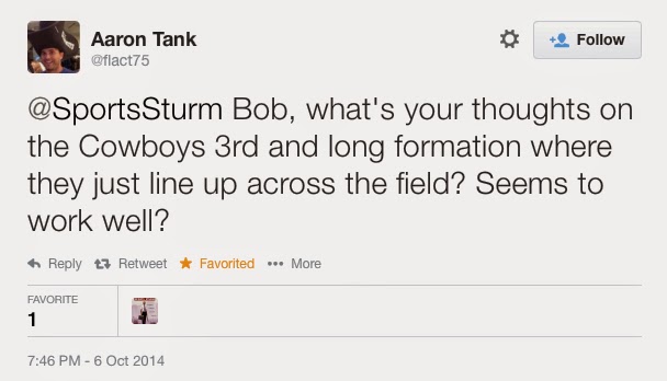 DEFENSIVE PARTICIPATION: No Bruce Carter and no Morris Claiborne means we start to test the depth. 5 defenders played every snap: Durant, Carr, Scanrick, Wilcox, and Church. The rest rotate throughout (although Rolando McClain is out there all snaps, too, until he aggravated his groin). Tyrone Crawford and Jeremy Mincey are playing the most on the DL with snaps around 45, with Hayden and Selvie around 35, Spencer and Melton around 25, and Crawford and J McClain under 20. It is tough to fully decipher what is health related and what is role related. But, I do think it is worth noting that Tyrone Crawford has gone from being a piece to THE piece. Hitchens played 34 snaps and Kyle Wilber was the only other LB to get a snap and he had 1. Sterling Moore took 38 snaps and otherwise, no other DB played than those 5. Thanks, Pro Football Focus for the exact math on the snap counts.