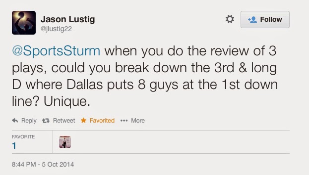 So, the conclusion that we come up with is to bring pressure. But, we are also facing a game without Bruce Carter at LB, meaning plenty of rookie LB Anthony Hitchens. So, how do we bring pressure without dedicating too many numbers to pass rush and then have to live with poor man-to-man coverages behind them that might not fit our personnel?