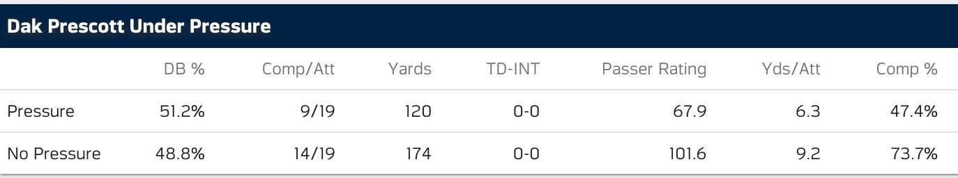 Dak was pressured 27 times in this game and sacked twice. McCarthy was pressured just 10 times and not sacked at all. This is more of what we have seen from Thursday Night in Detroit and you can definitely see that the solutions are not coming as easy for the offense anymore. The attention CeeDee Lamb is getting is substantial and for whatever reason, the George Pickens show has not been close to what it was and now we wonder why that is being so well taken away. Things are moving fast for this offense and it all seems to lead us back to protection is becoming more and more of a problem.
