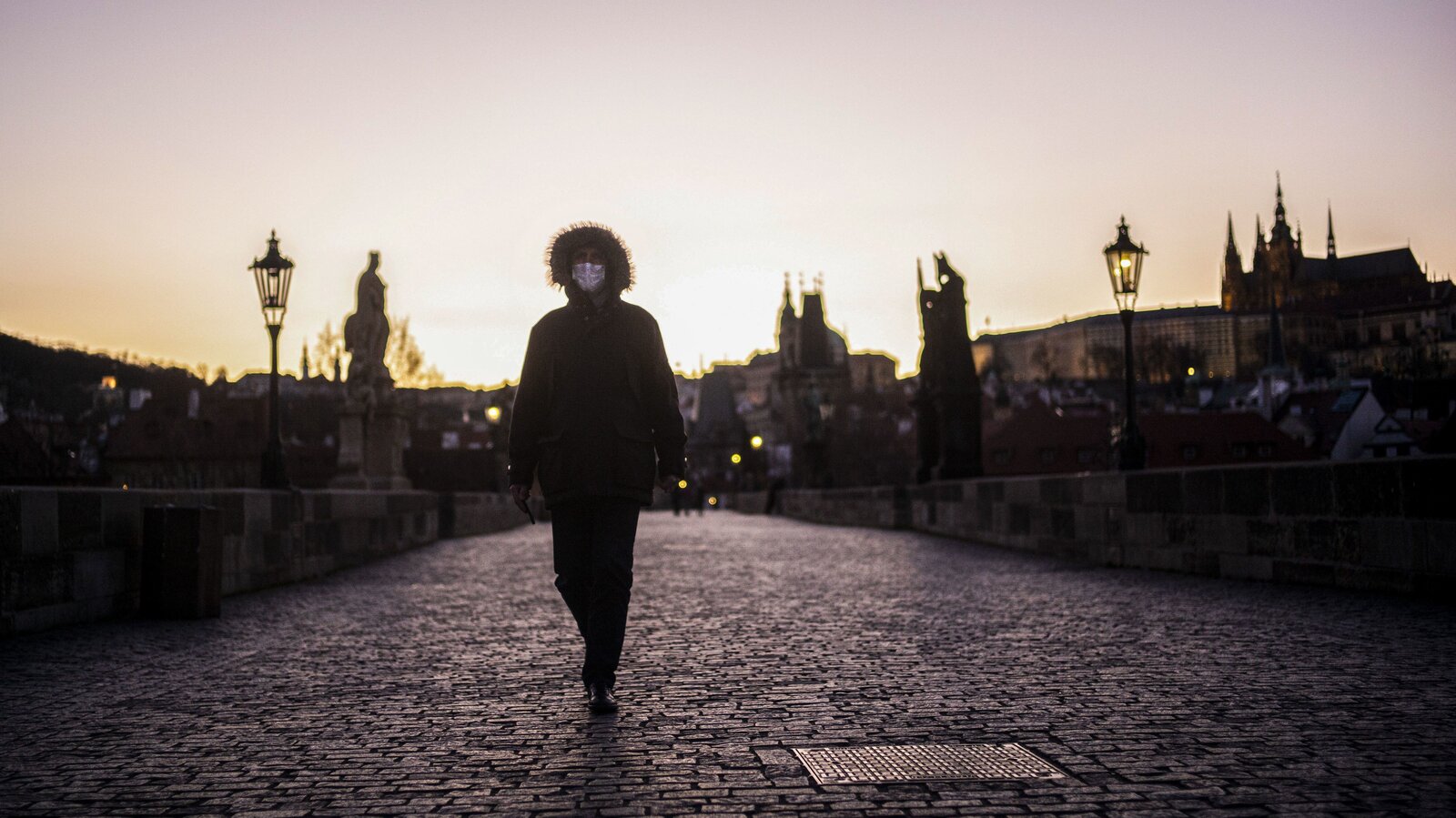 A man wearing a face mask crosses the Charles Bridge in Prague on Tuesday. The Czech Republic is one of a handful of places throughout Europe now mandating that residents wear face masks when they leave their homes.
