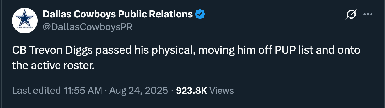 I didn’t know what to expect on this development and still am somewhat unclear about how close he is to being a factor in the proceedings, but Trevon Diggs might be good to go.